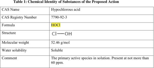Cơ quan quản lý dược phẩm và thực phẩm Hoa Kỳ FDA quy định hàm lượng HOCL tiếp xúc Thực phẩm không quá 60ppm.
