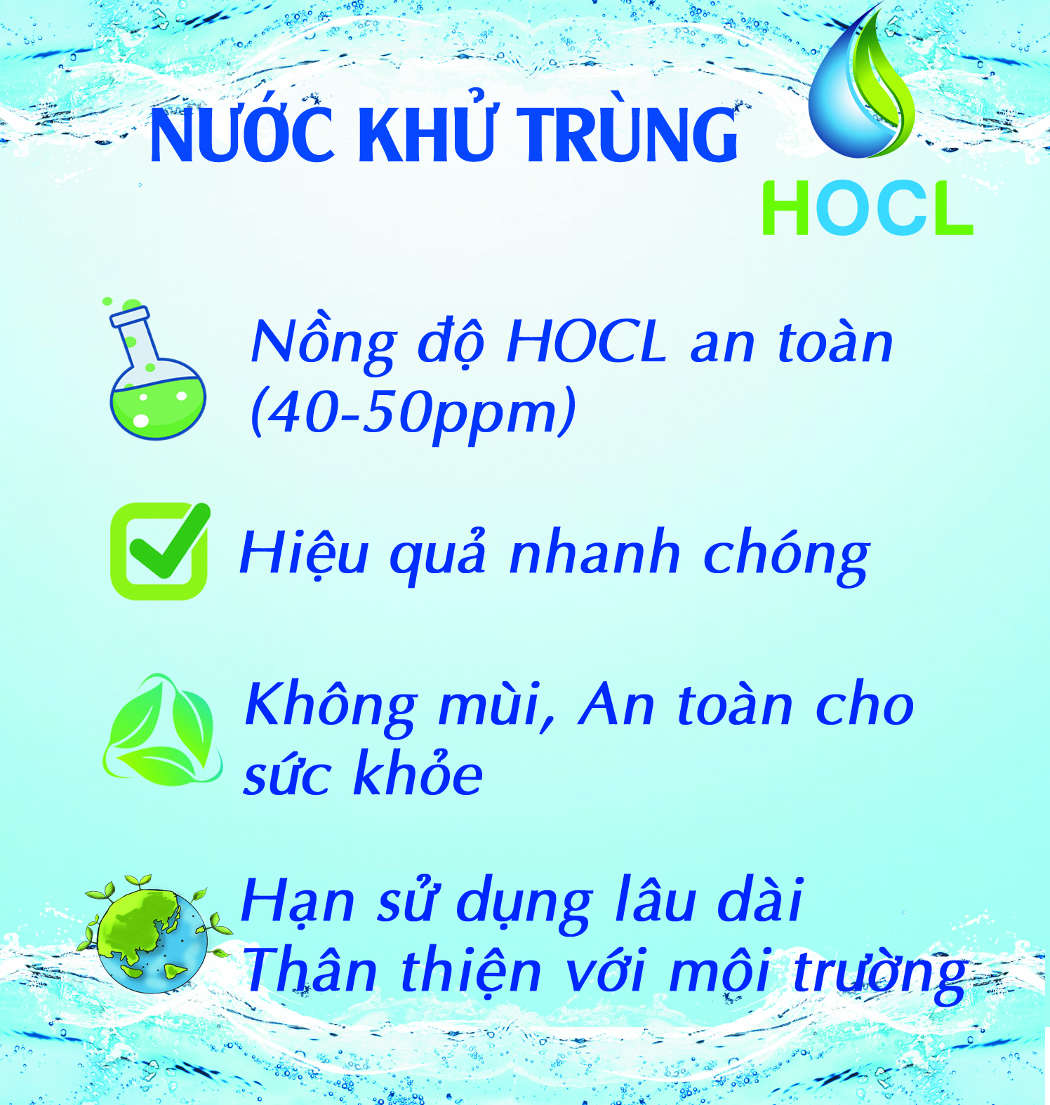 - Là nước điện phân Axit nhẹ chứa HOCL với nồng độ 40-50ppm